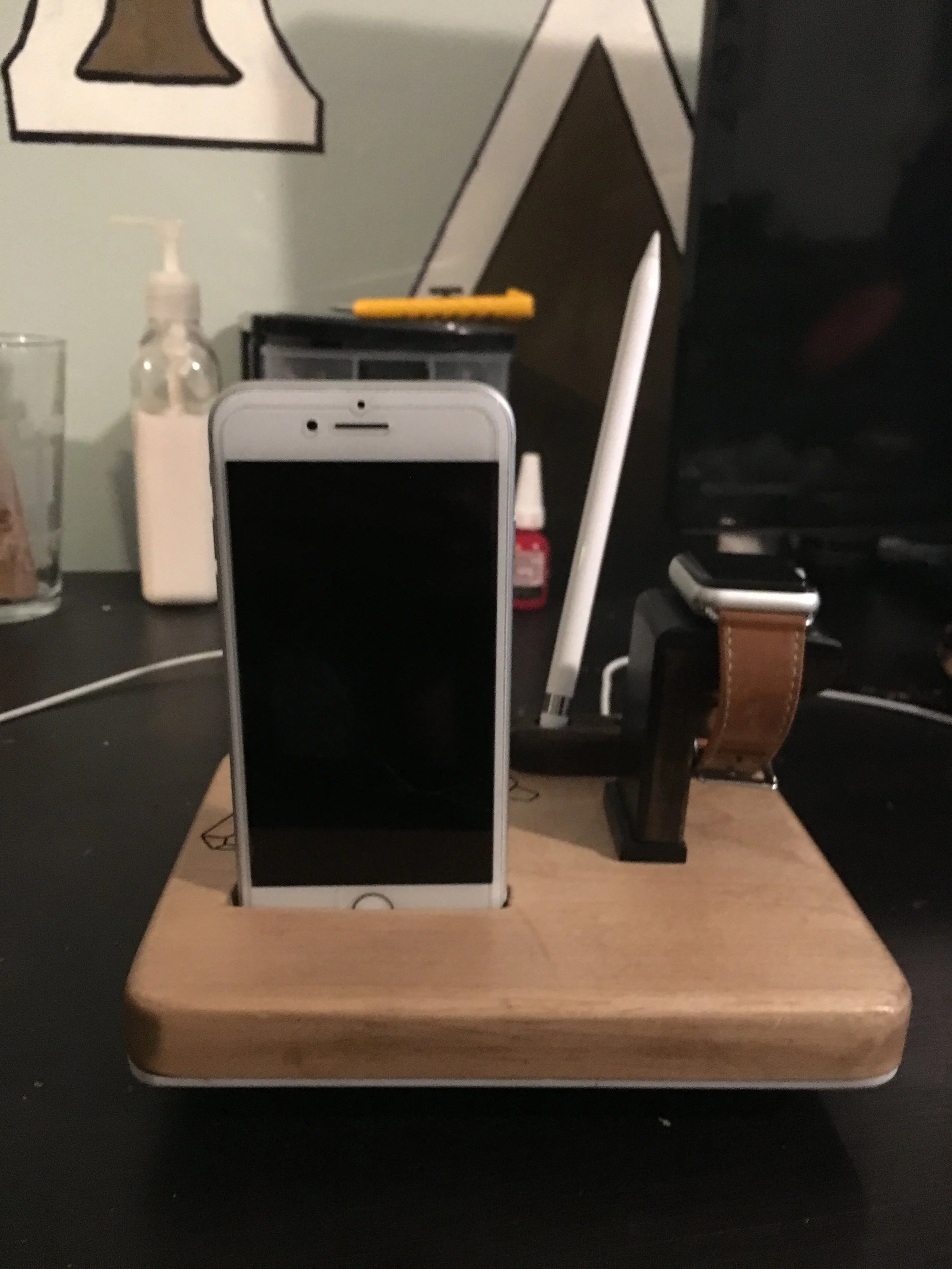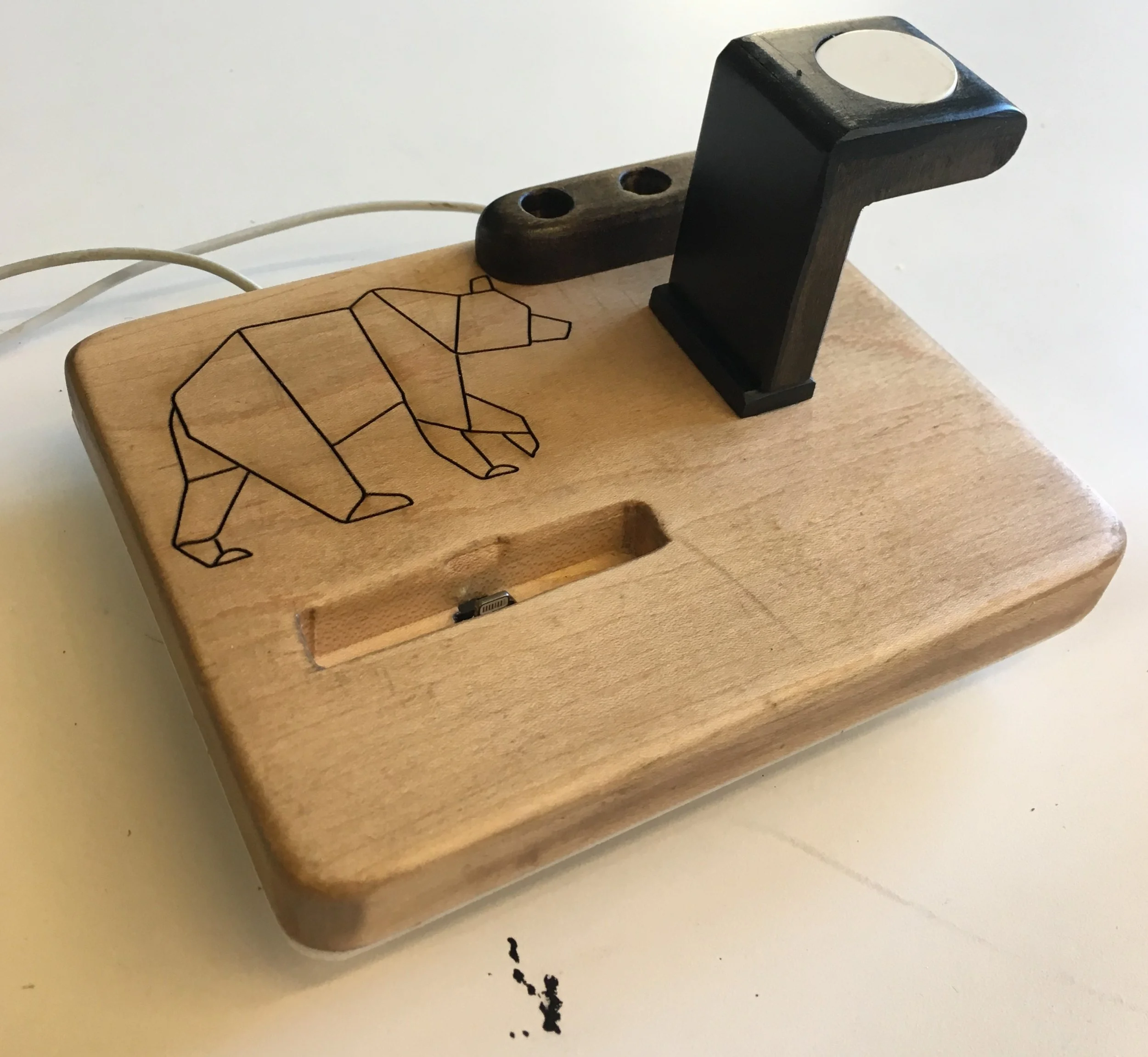 The wooden base was cut out on a bandsaw from an old piece of scrap. After milling out the iPhone slot and tunnels for the charging wires, I hand-sanded the wood and coated it in a clear, protective lacquer. Once I had routed both the iPhone and Apple Watch chargers through the wood, it was finally time to neatly cover it all up with acrylic.